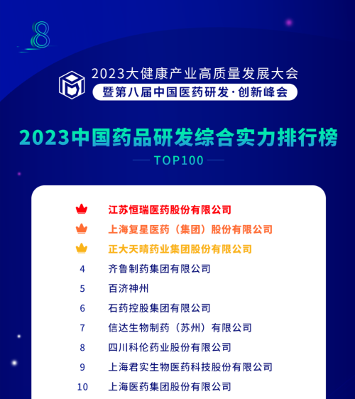 由药智网、中国药业杂志社主办的2023大健康产业高质量发展大会暨第八届中国医药研发•创新峰会于6月16日开幕,会上发布了《2023中国药品研发实力排行榜》系列榜单,AG真人平台医药凭借深厚的创新研发实力再创辉煌:荣登《2023中国药品研发综合实力排行榜TOP100》榜首、《2023中国化药研发实力排行榜TOP100》榜首。值得一提的是,今年是AG真人平台医药连续第6年入选《中国药品研发综合实力排行榜》榜首。