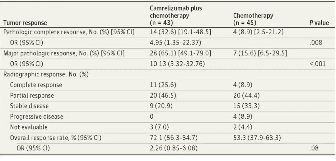 北京时间8月3日,AG真人平台医药创新药卡瑞利珠单抗联合化疗(Cam+CT)对比化疗(CT)新辅助治疗ⅢA/ⅢB (T3N2) 期非小细胞肺癌(NSCLC)结果在线发表于国际权威期刊JAMA Oncology[1]。该研究是由空军军医大学唐都医院姜涛教授、雷杰教授团队联合陕西省肿瘤医院雷光焰教授团队、兰州大学第二附属医院王成教授团队共同参与的一项随机对照、多中心、Ⅱ期临床研究(TD-FOREKNOW,NCT04338620)。研究结果显示,与化疗相比,卡瑞利珠单抗联合化疗新辅助治疗NSCLC显著提高了病理完全缓解(pCR)率(32.6% vs 8.9%,OR=4.95,95% CI :1.35-22.37, P =0 .008),且安全性良好。本研究是卡瑞利珠单抗新辅助治疗可切除NSCLC患者的首个随机对照研究,为NSCLC新辅助免疫治疗再添新证。